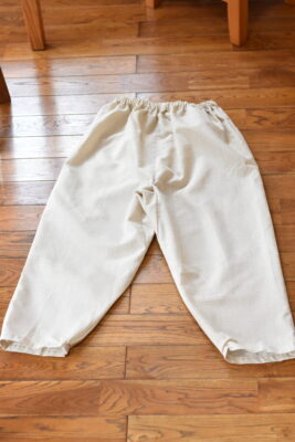 また、戦時中の女性の服装「もんぺ」をアレンジした「もんぺパンツ」(¥2000~)の販売もあります。イマヤのリメイク教室のメンバーが着物をほどいて作りました。ワイドパンツ、バルーンパンツに近い形もありますので、ぜひご覧ください。