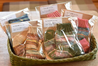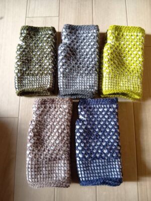 スマイルハウスさんのあったか小物もたくさん届いています。写真のアフガン編みのハンドウォーマーの他に、もこもこの毛糸で編まれた手提げバッグ、編みぐるみなどもあります。店頭でぜひご覧ください。