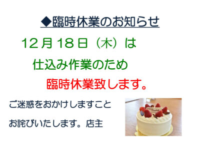 臨時休業 公開日: 2025年12月17日更新日: 2025年12月17日著者: imayaカテゴリー: お知らせ, ブログ 12月18日(木)は仕込み作業のため休業いたします。 12月21日(日)と12月22日(月)は12時から営業いたします。 関連記事 イマヤのシュトーレン2021 シュトーレンが店頭に並びました! イマヤのシュトーレン作りは、自家製の柑橘ピールとレーズンの漬け込みから始まります。ネーブルオレンジ、レモン、夏みかん、有機サルタナレ […] 公開日: 2021年12月8日更新日: 2021年12月9日著者: imayaカテゴリー: イベント, お知らせ, ブログ 7月26日(土)臨時休業のお知らせ 7月26日(土)は都合により臨時休業とさせていただきます。 大変ご迷惑をお掛けいたしますが、よろしくお願いいたします。 公開日: 2025年7月25日更新日: 2025年7月25日著者: imayaカテゴリー: お知らせ, ブログ 01 チョコに想いを込めて・・・ 2月5日(日曜日)・12日(日曜日)・13日(月曜日)は営業致します 2月8日までに5000円以上のご予約の方、フェルクリン(板状チョコレート)一枚プレゼント!! こんにちは ス […] 公開日: 2017年2月1日更新日: 2017年2月1日著者: imayaカテゴリー: イベント, お知らせ, ブログ