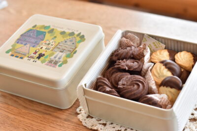 缶の中には、クッキー2種(さっくりバニラ・ココア)がぎっしり詰まっています。